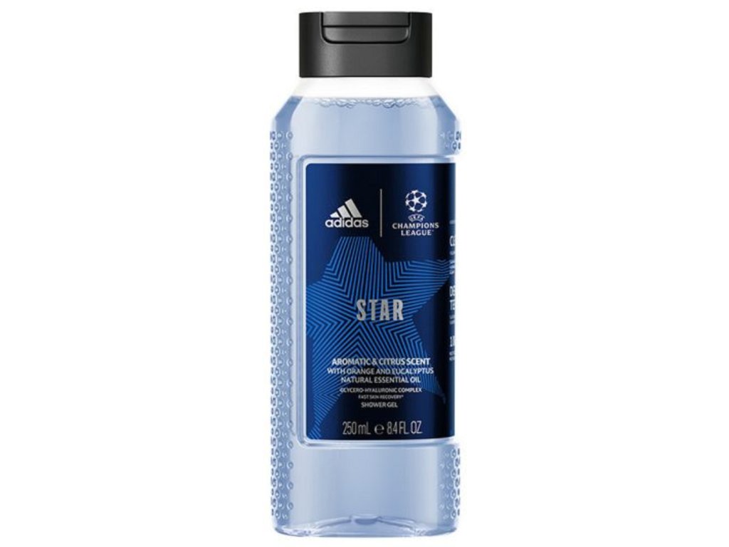 Adidas pánska vôňa UEFA Star má sviežu aromatickú vôňu s nádychom šumivého citróna a levandule zakončená zelenými listami fialky. Stredné tóny odhalia vôňu šťavnatého Jablka spojenú so srdcom kašmíru obohatenú o šalviu. Kombinácia teplej vanilky, údené pačuli a intenzívna vôňa machových listov tak zanecháva nezabudnuteľný mužský podpis champiónov.Sprchový gél zbaví vašu pokožku nečistôt, ale aj ju krásne prevonia a osvieži.