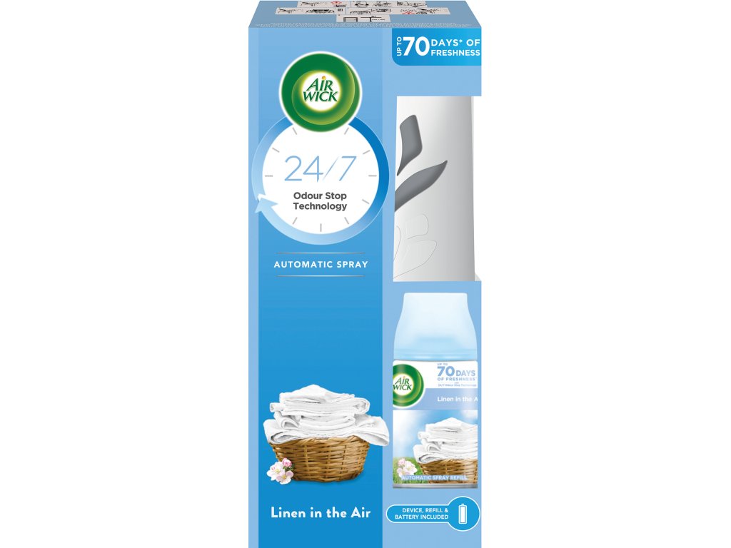 Zachytáva sviežosť bielizne trepotajúceho sa vo vetre, s jemnou vôňou zelených jabĺk. Vyberte si z troch nastavení pre dosiahnutie požadovanej intenzity vône. Zaveste na stenu alebo umiestnite na policu či skrinku. 1 AA batérie zahrnutá. Posilnite vôňu príbehu Vášho domova s automatickým sprejom od Air Wick Life Scents Freshmatic. Air Wick Freshmatic uvoľňuje dávky nepretržitej sviežej vône, takže Váš domov vždy prívetivo vonia. Dodajte vášmu domovu novú príjemnú vôňu až na 70 dní (pri používaní na najnižšej úrovni intenzity).Dodatočné parametre