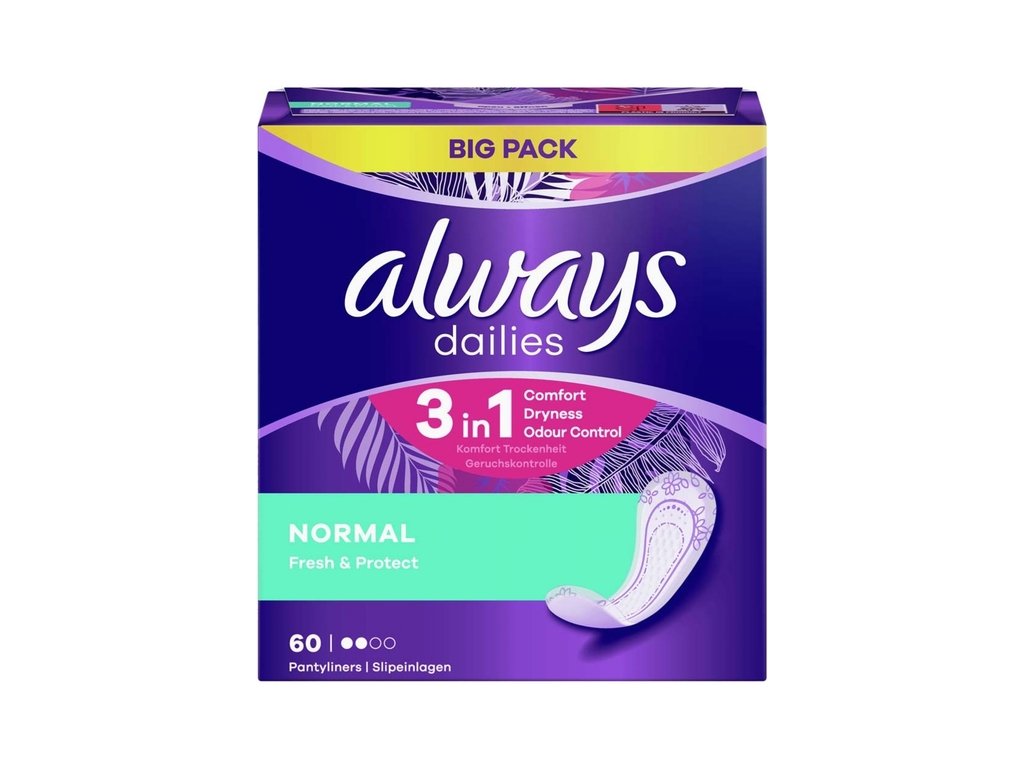 Always Daily Fresh Normal intímky 60 ks vám poskytnú každodennú diskrétnu ochranu pri zachovaní najvyššieho komfortu. Sú tak flexibilné a spoľahlivé, že ich sotva ucítite. Ich absorpčné jadro vám zaistí dokonalú ochranu, technológia neutralizácie zápachu je potom zárukou pocitu sviežosti po celý deň. Tieto slipové vložky boli dermatologicky testované a sú maximálne šetrné k pokožke.Dodatočné parametre