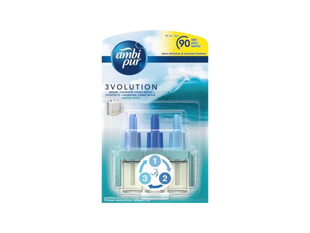 Náhradná náplň Ambi Pur 3volution Ocean Mist efektívne neutralizuje zápach. Nepretržite odstraňuje pachy a strieda 3 vzájomne sa doplňujúce vône, vďaka tomu zaisťuje neprekonateľnú sviežosť. Objavte krásu oslnivej vône, ktorá povzbudí vaše zmysly. Ocean Mist naplní váš domov elegantnou vôňou. Každých 45 minút sa automaticky vystrieda nová vôňa. Intenzitu osviežovača si môžete regulovať sami.Dodatočné parametre