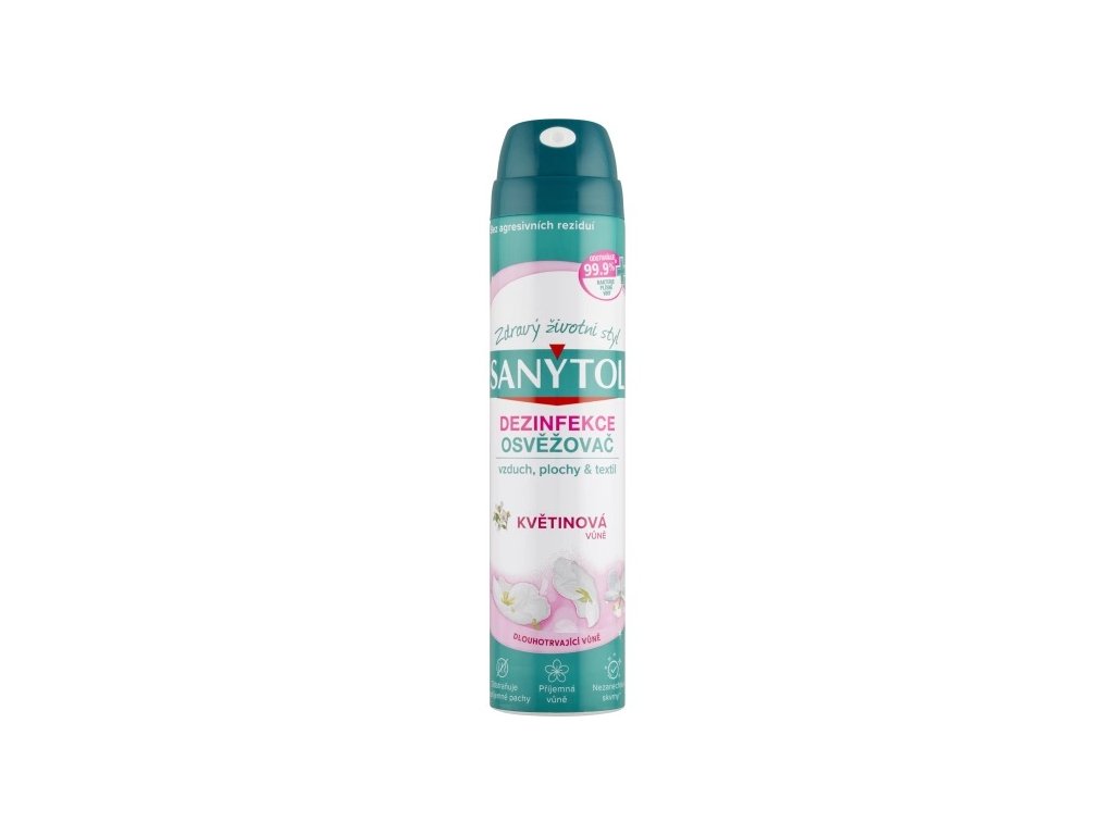 SANYTOL vyčistí vzduch a vydezinfikuje povrchy v jednom jedinom kroku. Jeho zloženie zaisťuje dokonalú hygienu a zanecháva príjemne sviežu vôňu. Zahubí 99,9 % baktérií, plesní a vírusov, vrátane vírusu chrípky typu A (H1N1).Dezinfikuje a čistí. Absorbuje a ničí pachy tým, že odstraňuje ich príčinu (mikróby). Pôsobí na vzduch, povrchy a bytové textílie. Nezanecháva škvrny, k textíliám je šetrný. Príjemne prevonia celú domácnosť kvetinovou vôňou.