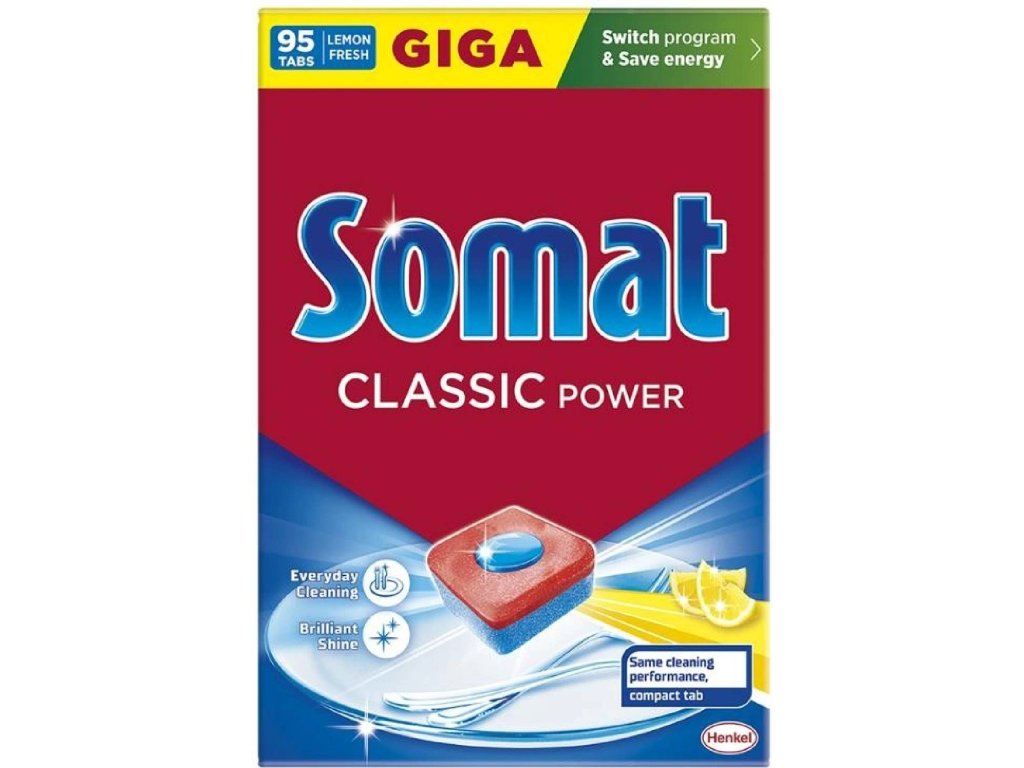 Tablety do umývačky Somat Classic Power Lemon s vôňou citróna neutralizujúce zápach pre žiarivo čistý riad každý deň!Žiadne dávkovanie, predmáčanie alebo starostlivosť po umývaní! Vyskúšajte silnú a účinnú čistiacu silu s tabletami do umývačky Somat. Silná a rýchlo pôsobiaca receptúra Somat Classic Power Lemon si poradí s každodennými zvyškami jedla, mastnotou alebo škvrnami od čaju a kávy. Somat tablety sa rýchlo rozpúšťajú a pôsobia okamžite, nezanechávajú nežiaduce zvyšky, ako je mydlo, takže riad a poháre zostávajú žiarivo čisté po každom programe umývania riadu, a to aj na eco program s nízkou teplotou. Tablety na umývanie riadu Somat Classic Power Lemon sú určené na použitie na všetky taniere, poháre, hrnčeky, fľaše, strieborné riady, hrnce a panvice vhodné do umývačky.