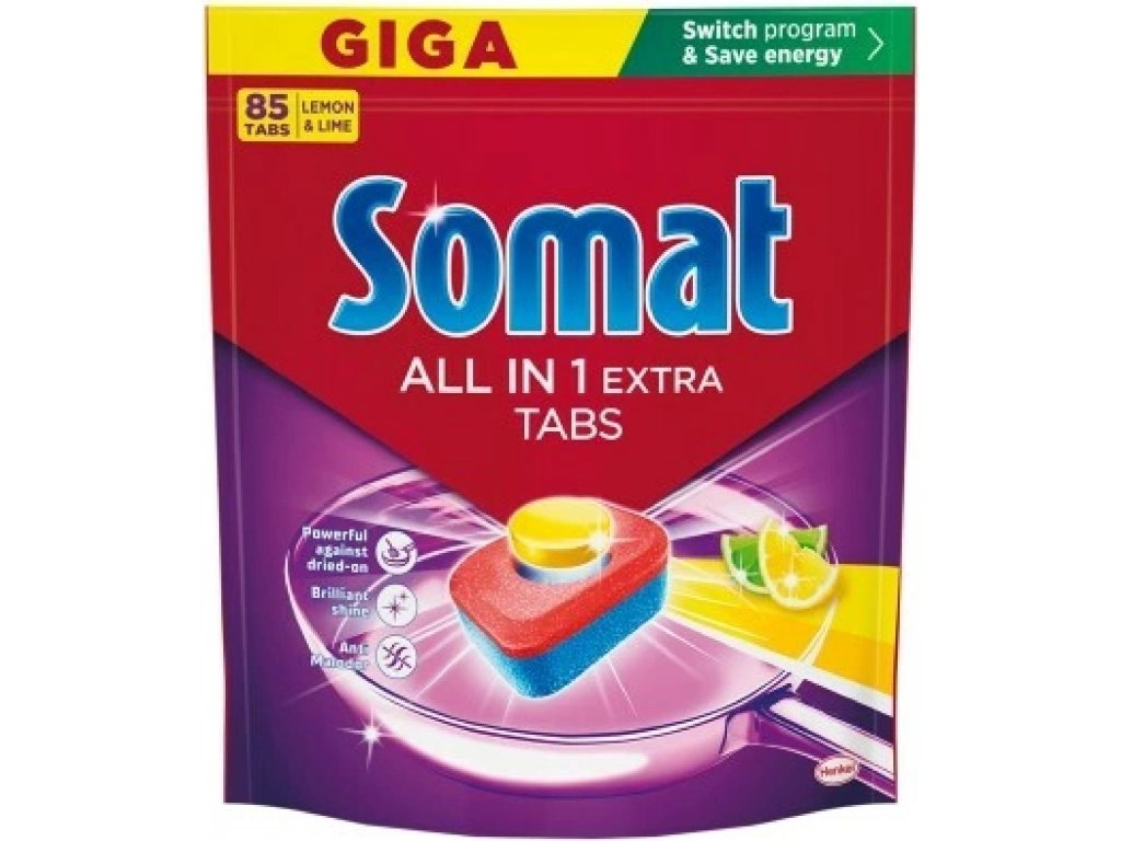 Somat tablety do umývačky All in 1 Extra Lemon & Lime, 85 ksSomat All-in-1 Extra Lemon & Lime tablety do umývačky s vôňou citróna a limetky neutralizujúce zápach pre žiarivo čistý riad aj na krátke a eco programy s nízkou teplotou!