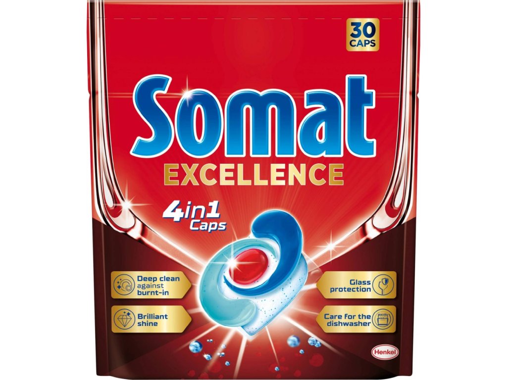 Somat Excellence 4v1 kapsule na umývanie riadu obsahujú prémiový multifunkčný prostriedok na umývanie riadu vyrobený z prášku v kombinácii s 3 jedinečnými pevnými gélovými komorami v biologicky odbúrateľnej fólii rozpustnej vo vode.Vďaka silnému zloženiu, ktoré pôsobí proti odolným pripáleninám, Somat Excellence tablety do umývačky riadu sú vhodné pre všetky taniere, poháre, hrnčeky, fľaše, hrnce, plasty a panvice vhodné do umývačky. Tento prémiový prostriedok do umývačky riadu nezanecháva žiadne zvyšky ani zaschnuté škvrny od vody, takže po ukončení umývacieho cyklu nie je nutné dodatočné leštenie. Namiesto toho si môžete užiť novú úroveň dokonale žiarivého lesku! Priamo z umývačky na váš stôl.