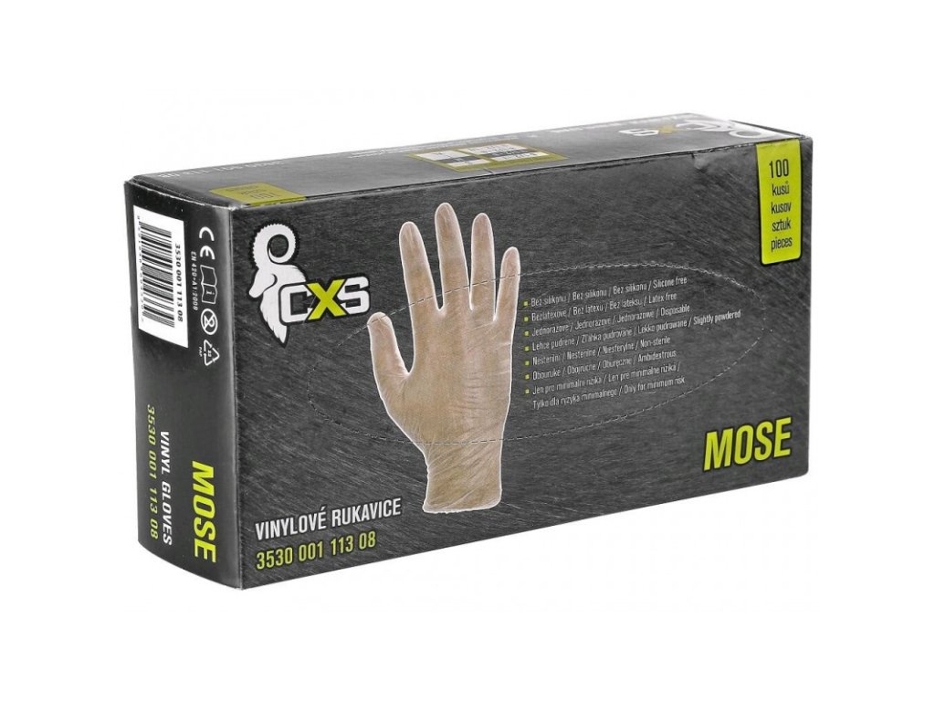 Rukavice MOSE vinylové jednorazové púdrované balenie 100 ks• Jednorazové rukavice
